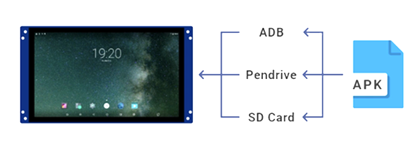 通过U盘或SD卡复制软件包 (APK) 并使用 Android 本机安装程序,或通过USB和ADB将显示器连接到电脑,然后一键安装。